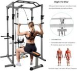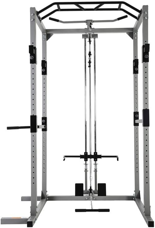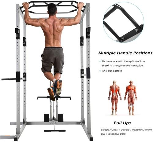 MULTI-TALENTS : En outre des tractions, des flexions ou des développés couchés, il est possible de fixer 2 barres de traction dans le coté droit safety spotter, idéal pour des flexions bras fléchis avec ou sans ceinture de poids. Cette cage rend tout possible. La barre de traction ajoute au Rack une fonctionnalité pratique. comprend des systèmes de poulie haute et basse. Ses 2 câbles (inférieur et supérieur) répondront à tous les besoins du sportif. La capacité de charge est conçue de manière à pouvoir supporter tous types de poids, avec un diamètre de fixation de 30 mm. Enfin, une batterie de ressorts assure la stabilité des poids utilisés. Cette station de musculation est également très solide, elle peut effectivement accueillir jusqu’à 300 kg sans faiblir. Dimensions (L x l x H) : 145,5 x 141 x 213.5 cm ;73.5 kg. Pieds en caoutchouc : Avec des pieds en caoutchouc pour les pattes de la cage, vous pouvez être sûr qu’elle ne raye pas votre sol. Développement musculaire: développe les muscles du haut du dos, des épaules et des bras (biceps et triceps) avec une variété d’exercices tels que les larges lats pull-down, les triceps extensions et plus encore. Système de poulie à roulement à billes pour un fonctionnement fluide.
