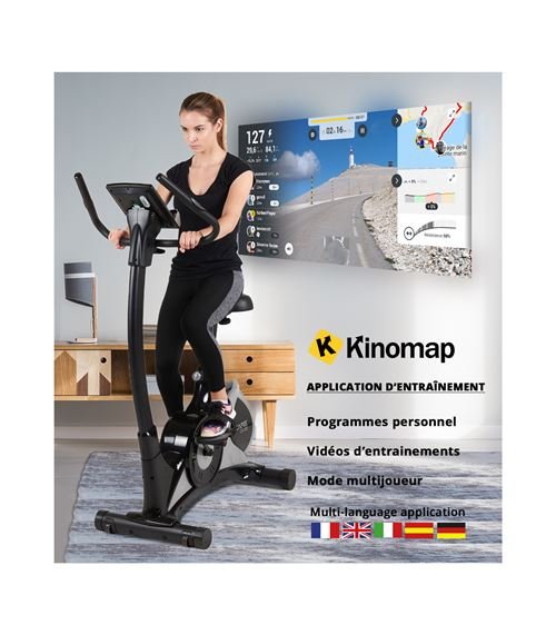 Le vélo CV-390 est doté d’une console avec 7 fonctions intégrées, des programmes accessibles en quelques secondes, et est compatible avec l’application de coaching KINOMAP pour un suivi de vos performances et un entrainement personnalisé.